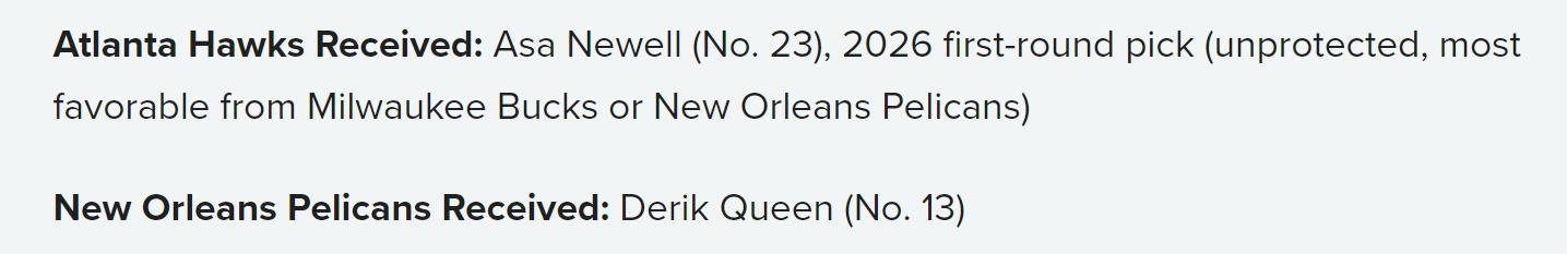 结果是老鹰队用13号签换回23号签选中纽厄尔,外加一枚26年无保护首轮签,按照雄鹿与鹈鹕的状况,这枚首轮签极有可能是乐透签,老鹰队可谓是一边倒胜利。