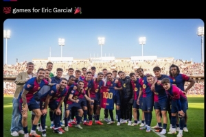 本场比赛埃里克-加西亚首发登场,这是他加盟巴萨以来各项赛事第100次出场,赛后他也获赠球队100号定制球衣,并与全队球员合影留念。
