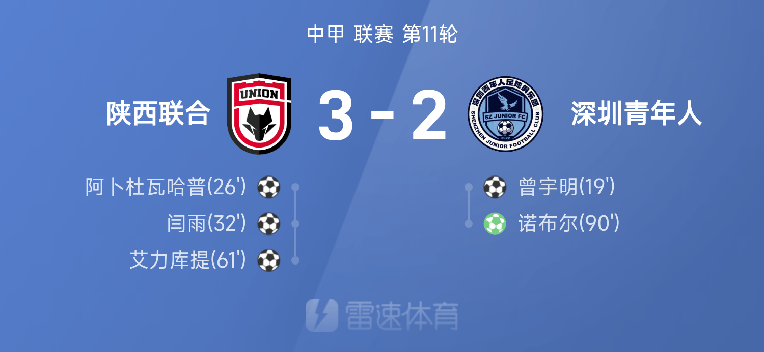 06月01日讯 25赛季中甲联赛第11轮,陕西联合3-2战胜深圳青年人。全场比赛,阿卜杜瓦哈普、闫雨、艾力库提破门建功,诺布尔、曾宇明破门难救主。